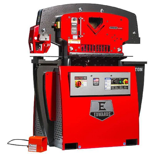 The Edwards Elite 110 ton Ironworker is a workhorse with plenty of power for nearly any job. Other standard features include four available work stations, a universal open tooling cavity that can hold a variety of optional tool sets, a 14-inch bar shear, angle shear, and heavy-duty punch station. Like all Edwards machines, this unit works in a completely vertical motion - straight down on the work. There is no arc of tool against the material to be cut or punched. All stations operate as a unit so you can move from punch to shear to angle shear without changing or adding any new equipment.