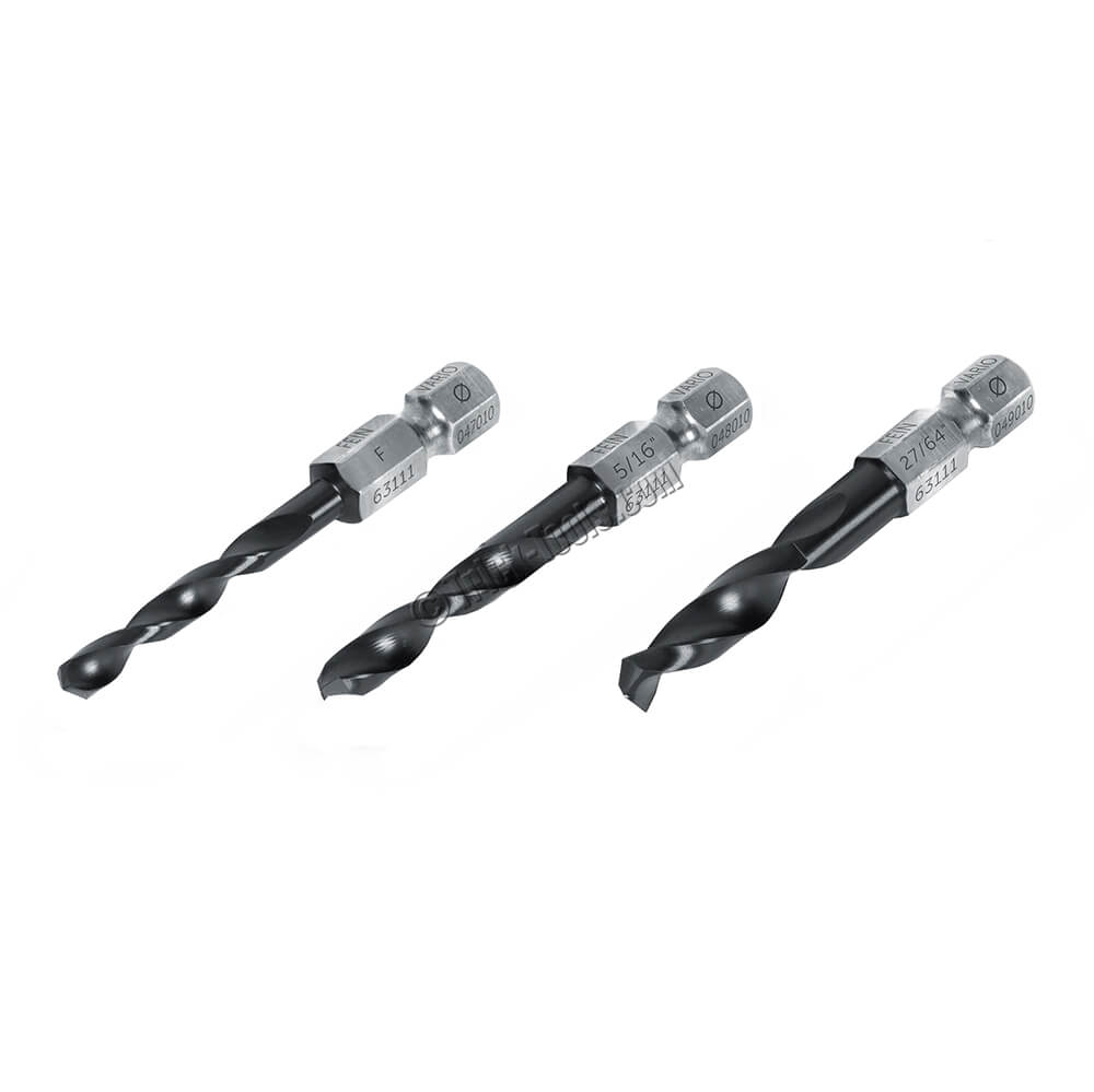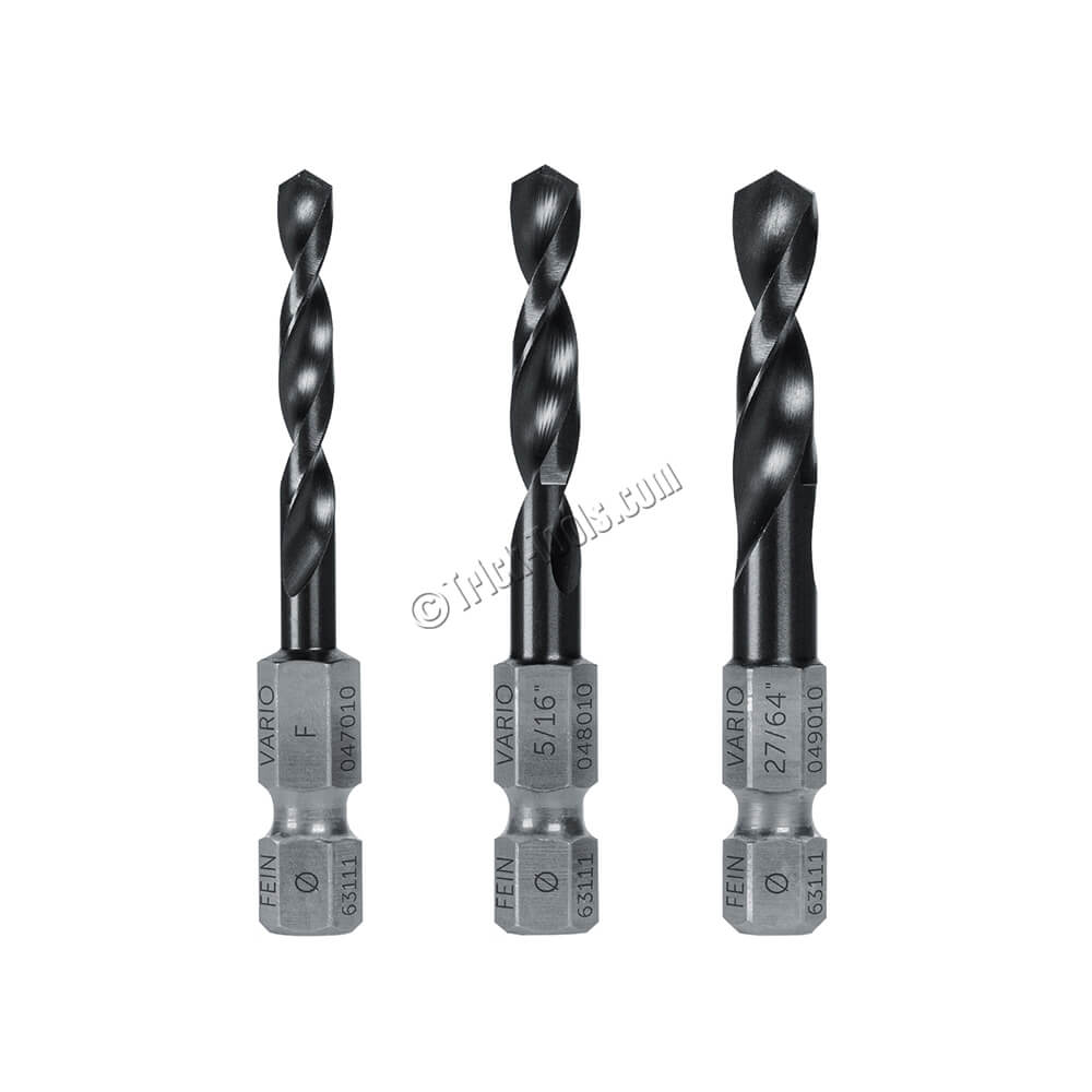 This 3-piece Tap Size Twist Drill Set from Fein Power Tools uses a 7/16 (11mm) hex shank and works with the new Fein Vario Drive System. The bits are made from tool steel with a TiAIN (titanium-aluminum-nitride) coating and special impact wrench compatible cutting geometry. These bits can be used with brass, aluminum, mild steel, and even high-strength steel up to 130 ksi.