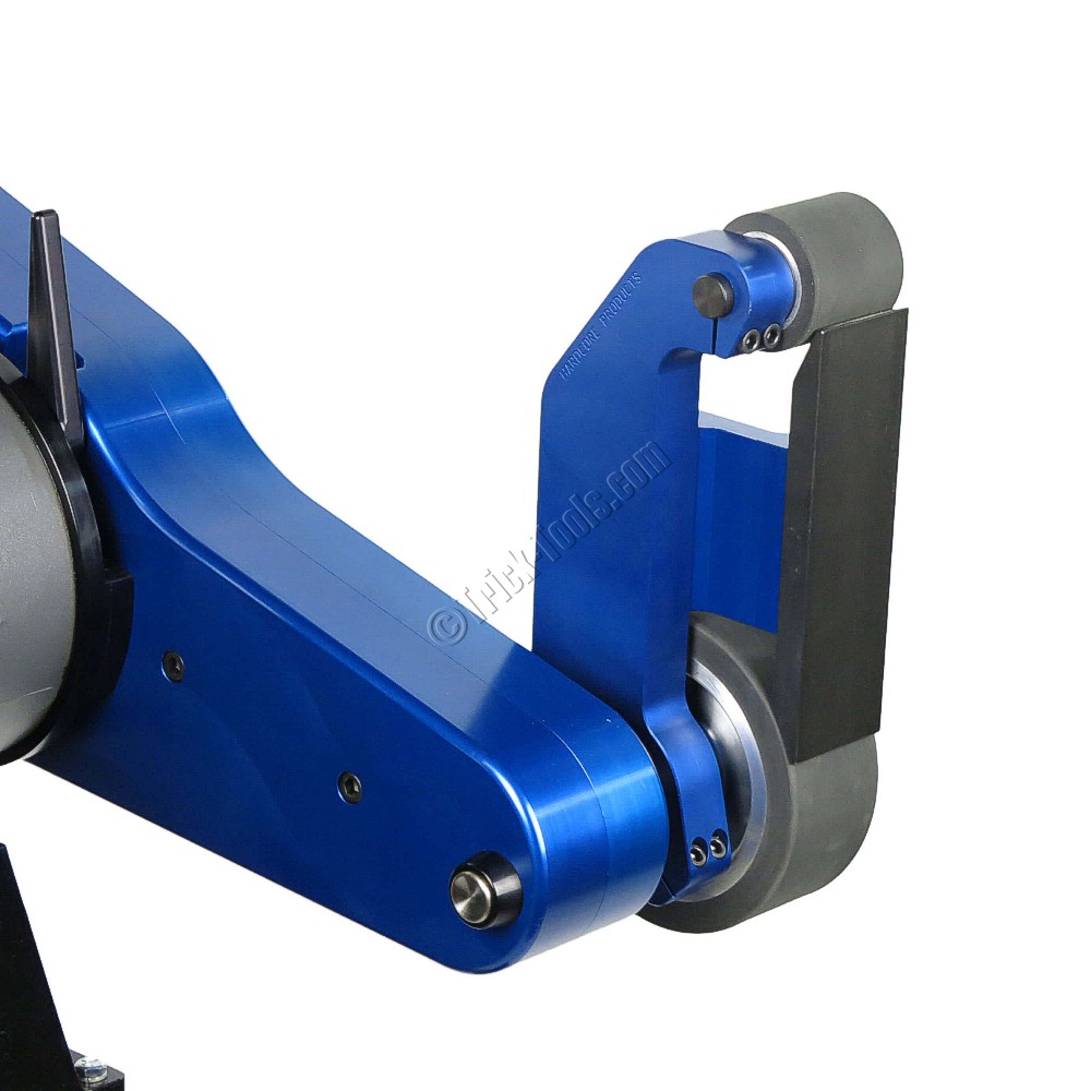 This Hardcore belt grinder attachment has a 2 x 6-1/2 inch re-surfaceable platen mounted behind the belt for flat grinding. The platen can be removed for slack-belt grinding, and contact grinding can be performed on either the 2 inch or 5 inch wheels.