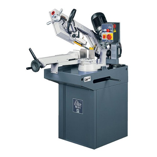 The Hyd-Mech PH211 Mitering Head Band Saw is an economical sawing solution that provides exceptional cutting capability for light production and maintenance applications. These machines come with a sturdy base with pull out coolant tank. Mitering cuts up to 60 degrees are attained easily with the mitering head that rides on pre-loaded taper bearings offer smooth angle adjustment. Blade drive load is monitored and the saw will shut off if the blade loses tension. Material loading and unloading is quick and easy with the quick-cam vise. Material being cut and blade are cooled and lubricated with the on-board coolant system. Repeatable cuts are done with the adjustable length stop rod.
