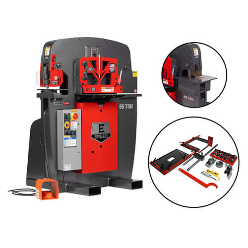The Jaws 55-ton Ironworker has four available workstations including a 14-inch bar shear, angle shear, heavy-duty punch station, and a universal open tooling cavity that can hold a variety of optional tool sets. Additionally, an elaborate productivity package consisting of a Coper Notcher Accessory, 10 punches and dies with storage rack, punch gauging table, coper notcher gauging table, 48-inch backstop, quick-change coupling nut, and an LED Work light is included to streamline your production process. All Edwards machines now include PowerLink Hydraulic Accessory Ports! See the Accessories tab for a growing selection of accessories like Shop Presses, Press Brakes, Tubing Benders, and Rollers that utilize your Edwards Ironworker hydraulics to run.