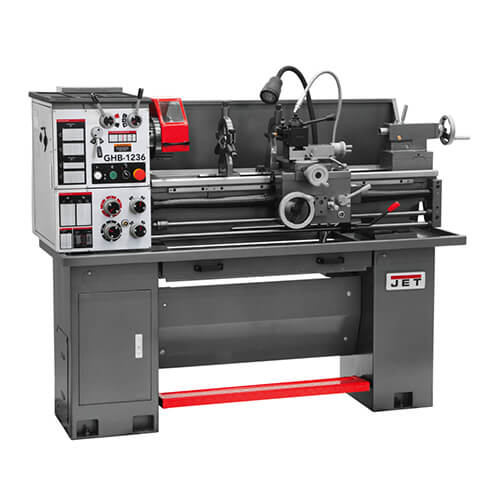 The JET GHB-1236 is a 12 x 36 lathe that is a great entry machine for most job shops or schools. It features an enclosed gearbox that ensures smooth and quiet operation and its precision roller bearings support a hardened and ground spindle, allowing for tight tolerances essential in high-quality machining.