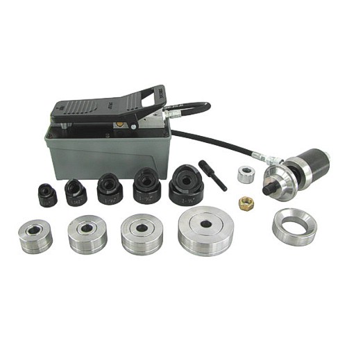 1.115, 1.362, 1.687, 1.937, and 2.375 inch dimple dies, ram and adapters, air/hydraulic pump