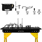 The Scout 36 Heavy Duty Welding Fixture Sawhorse works great when on the job site, working with long material, or needing to secure small parts. The heavy-duty model features adjustable height legs that quickly change from 33-1/2 to 42-1/2 inch working height. The 6 x 36 inch nitride fixture plate features 5/8 inch holes spaced 2 inches apart. With a 2000 lbs weight capacity each, and weighing in at only 56 lbs, these Scout 36 Heavy Duty Sawhorses are ready to take on even the heaviest of jobs. The 12 piece fixturing kit gives you an assortment of clamps and stops to get you working fast!