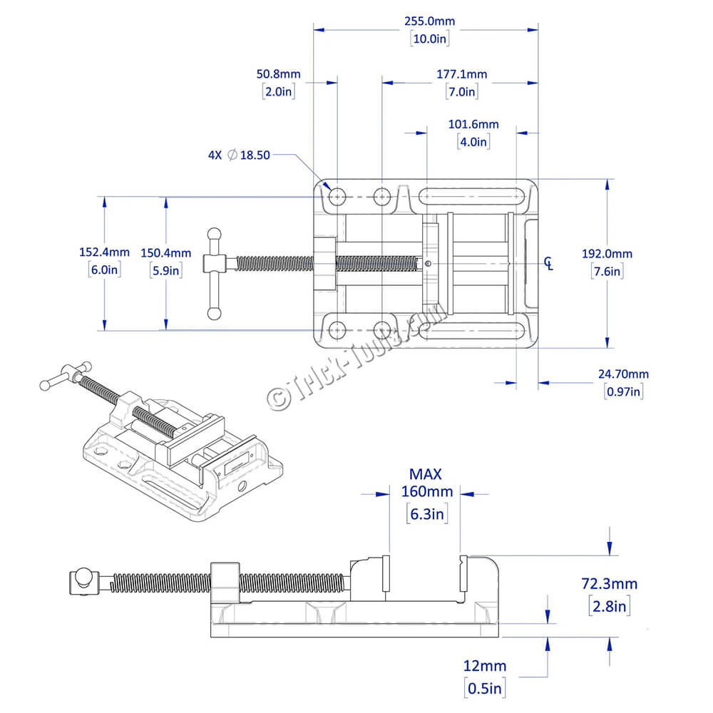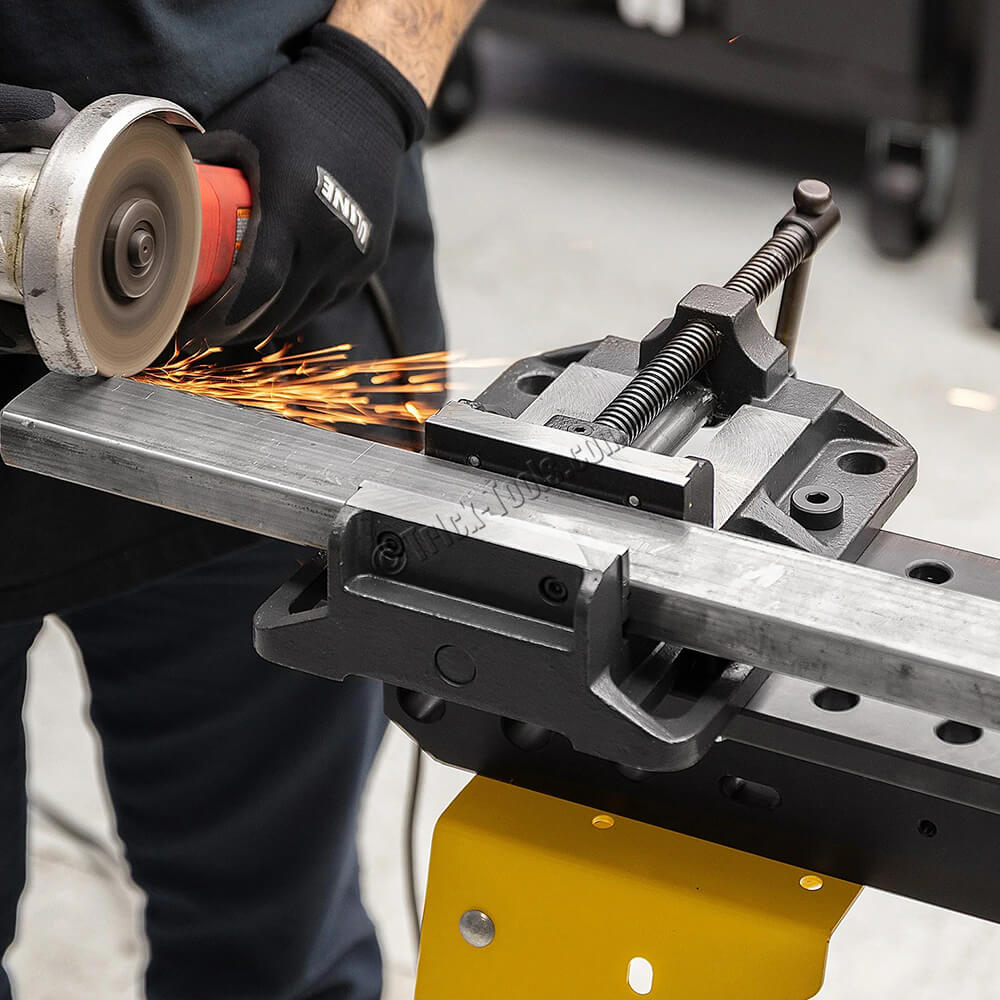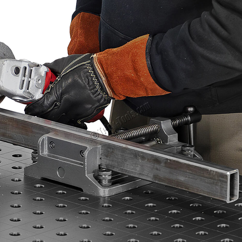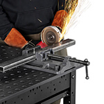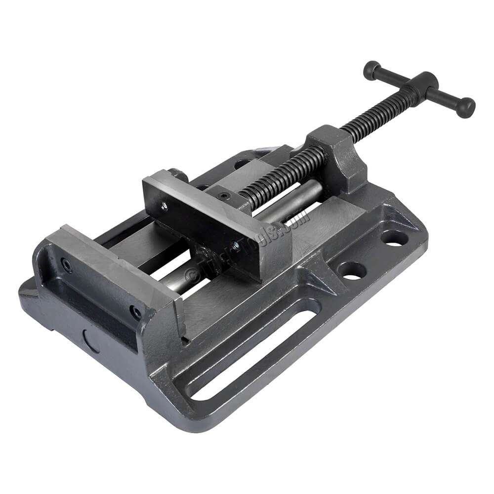 This 6-inch Low-Profile Drill Press Vise from Strong Hand Tools features 5/8 holes and 4-inch shoulder slots for easy mounting on 5/8 BuildPro fixture tables or any 5/8 or 16mm fixture table with 2-inch spacing. Its cast-iron body minimizes vibration, while the precision-machined bed and base ensure accurate positioning. The hardened, replaceable steel jaws feature horizontal and vertical V-grooves for a better grip on circular stock.