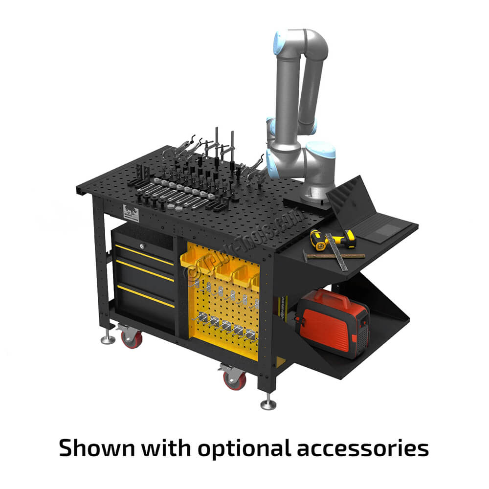 The 48 x 30 inch Rhino Cart Mobile Fixturing Station is unlike any welding table on the market! This revolutionary design takes the popular BuildPro welding table top, with its precision finish and unique modular fixturing design, and combines it with a handy mobile cart. The nitride treated steel top features a black oxide finish and is reversible if one side is eventually damaged.
