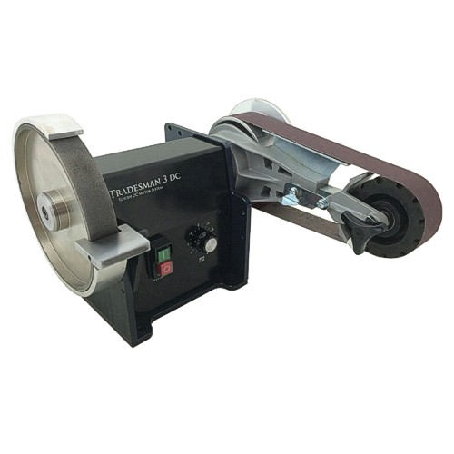 The Tradesman 3 bench grinder is a precision hand-built machine that is assembled by the engineers who designed it. The ultra quiet DC Motor is variable speed from 400 to 4000 RPM and maintains power throughout the range. This machine incorporates the 2x36 inch Linishall belt grinder. A standard 180 grit precision-plated wheel is mounted opposite the belt grinding attachment. This versatile tool can tackle almost any sharpening or shaping need. Belts change in seconds from grinding, to sand, deburr or polish. A variety of belts and discs are available for any project.