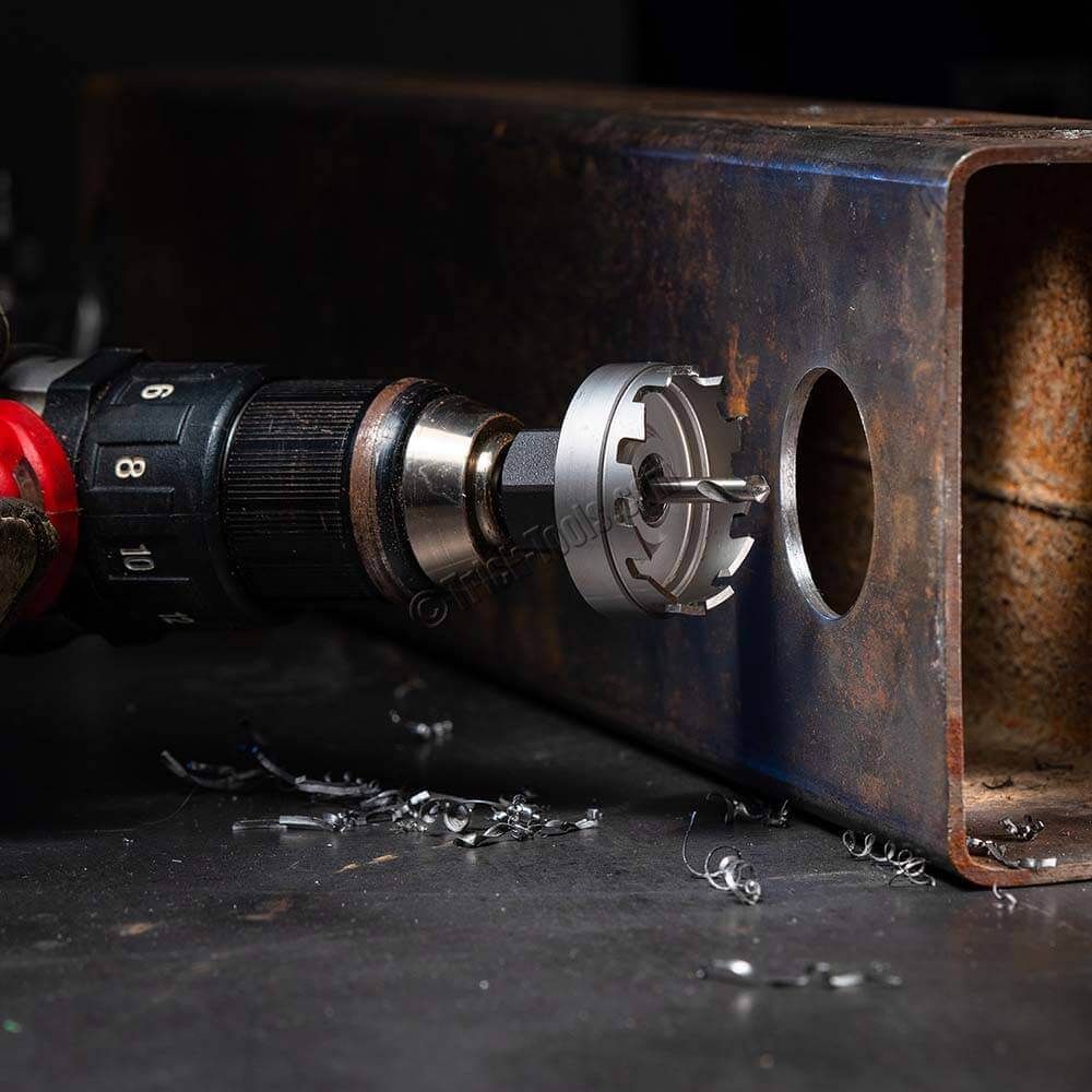 Holcutters by Hougen are not hole saws. They're precision ground, heat treated tools that easily cut thru stock without ripping, tearing, and pushing like typical hole saws. Holcutters produce holes three times faster and cleaner than hole saws in sheet metal and have dramatically extended tool life. All sizes have a shoulder to prevent plunge-thru, which is especially useful when drilling into live electrical boxes. For materials up to 1/8 inch thick. A single arbor (p/n 14009) is used for all sizes and is required for use unless using the optional speed reducer.