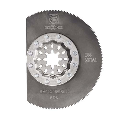 Solid HSS saw blade for sheet metal up to approximately 1/16 inch. Also for plastics, fiberglass, and wood. Outstanding cutting speed. Clean, narrow 1/16 inch cutting line. The segmented shape allows for easy cutting in a corner or up to a flange without over-cutting. Offset mounting allows for flush cuts.